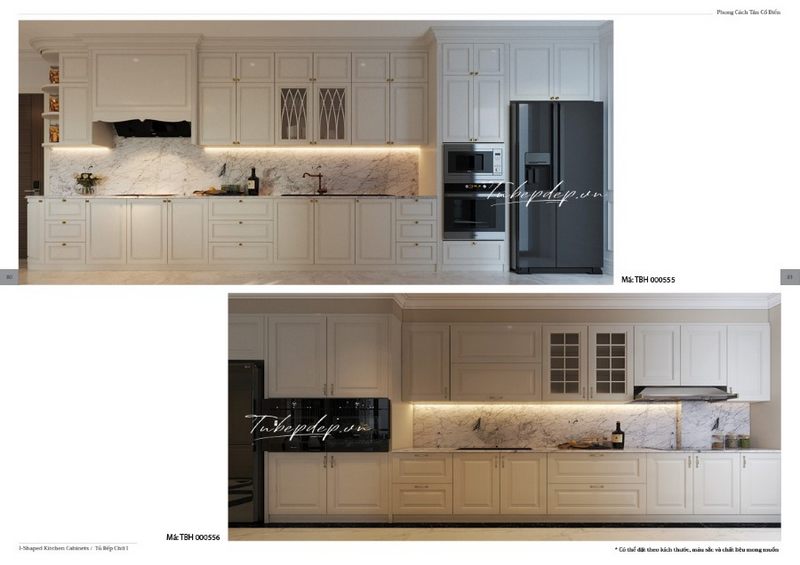 Sử dụng tủ bếp tân cổ điển màu trắng chạy dài thẳng kiểu chữ i phù hợp cho cả chung cư, nhà phố hay biệt thự