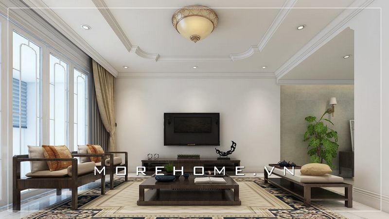 Trong thiết kế nội thất phòng khách chung cư tân cổ điển kết hợp hiện đại, có rất nhiều người lựa chọn ghế sofa làm điểm nhấn trang trí. Ghế sofa vải đem lại sự hài hòa, trang nhã cũng như giá thành hợp lý. Bên cạnh đó, kệ TV cũng là một điểm đáng lưu ý khi trang trí phòng khách. Kệ TV thường được làm bằng gỗ công nghiệp cao cấp An Cường đảm bảo tính bền bỉ và đẹp. Thiết kế mảng tường treo của TV rất ấn tượng với những cái phào nổi đúng chất phong cách tân cổ điển.
