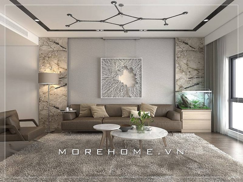 Bố trí nội thất phòng khách hiện đại độc đáo với bể cá phong thủy.