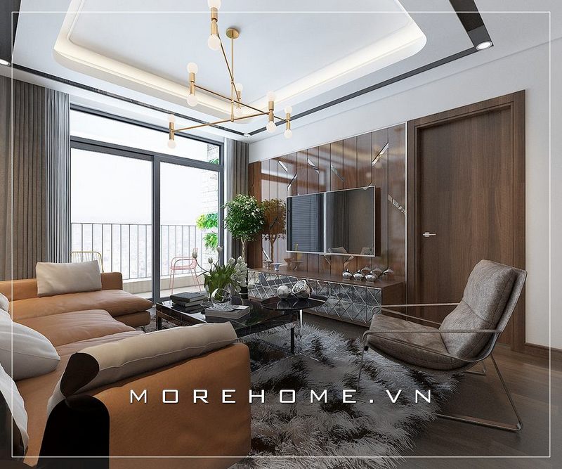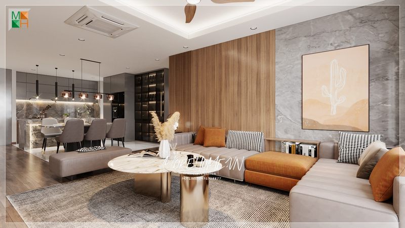 Thiết kế phòng khách chung cư hiện đại sử dụng đồ nội thất gỗ công nghiệp cao cấp mang đến sự sang trọng và đẳng cấp trong tình đường nét