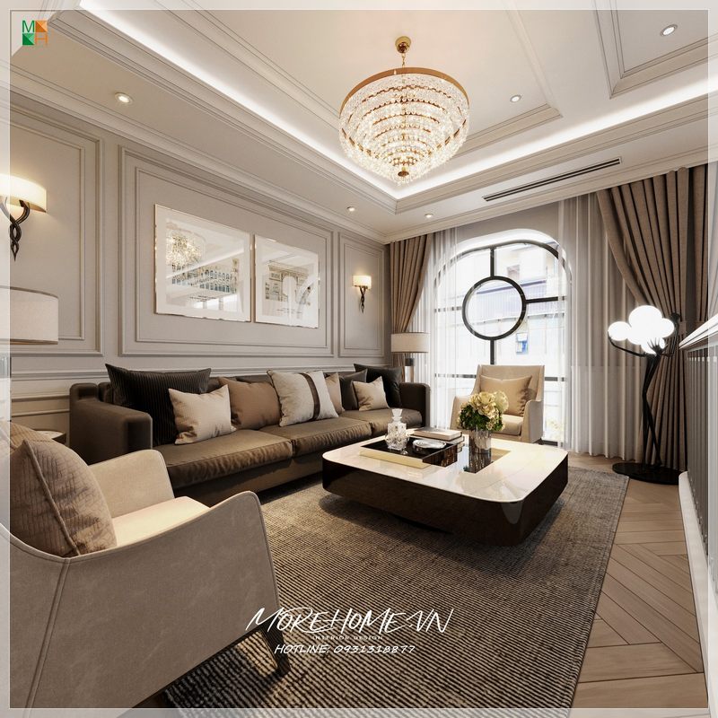 Không gian phòng khách chung cư sang trọng với thiết kế tân cổ điển tạo nên vẻ đẹp lịch lãm cho ngôi nhà