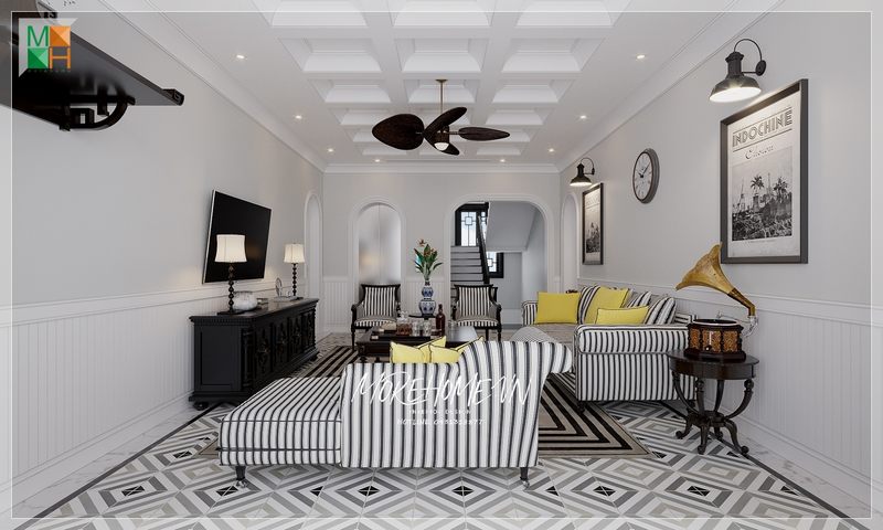 Sofa Tân cổ điển bọc nỉ màu trắng nổi bật kết hợp với các vật dụng cùng tông trong phòng tạo cảm giác phóng khoáng cho phòng khách của gia chủ