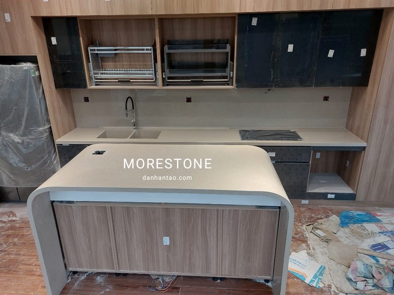 Đá bếp đá nhân tạo Hàn Quốc là lựa chọn phổ biến cho không gian bếp hiện đại nhờ tính thẩm mỹ cao và độ bền vượt trội. Với bề mặt mịn màng, dễ dàng vệ sinh và khả năng chịu nhiệt, đá nhân tạo Hàn Quốc không chỉ tạo nên vẻ đẹp sang trọng mà còn mang lại sự tiện lợi trong sử dụng. Chất liệu này có nhiều màu sắc và vân đá đa dạng, dễ dàng kết hợp với các phong cách thiết kế bếp khác nhau, giúp không gian trở nên tinh tế và hiện đại.